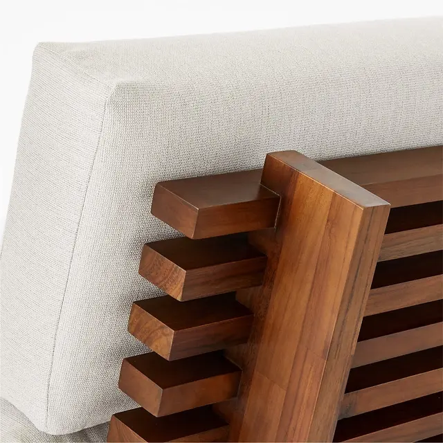 Low-slung and appealingly boxy outdoor loveseat by Ceci Thomspon looks rich in stained teak wood. Inspired by Japanese joinery, rows of horizontal teak slats exude a minimalist and modern attitude, while removable, fade-resistant natural cushion covers are tailored to fit just so.