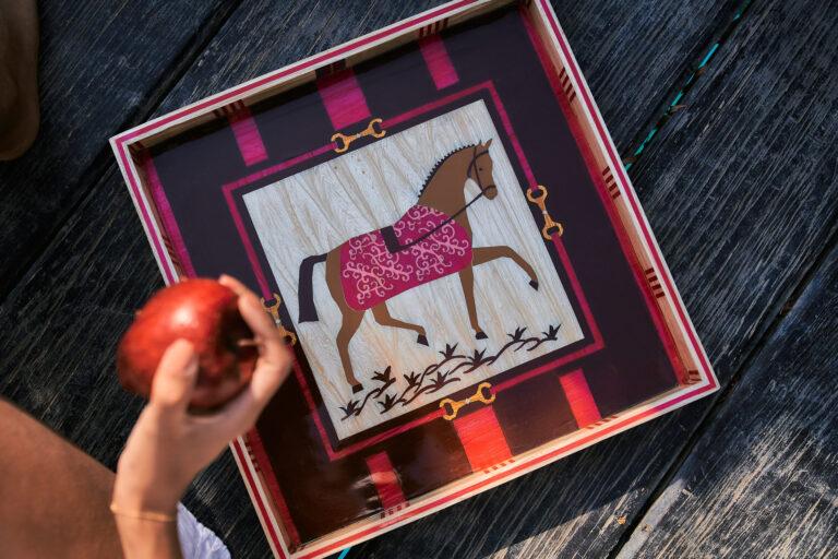 Highest quality of wood with glossy finish inlaid with mixture of mother of pearl and acrylic