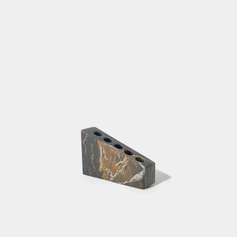 The toothbrush holder is made from a single piece of natural stone, creating a uniformity of color and protecting the seamlessness of the piece. The holes run right through, meaning that