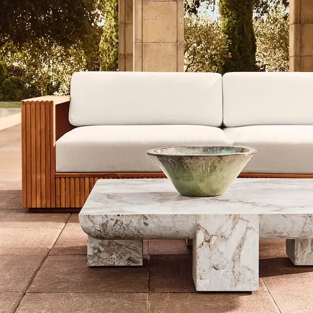 Vertical channels of teak wood give Barcelona-based Mermelada Estudio's outdoor sectional sofa the look of a modern classic. Unfinished teak has a warm brown tone that will weather to a silvery grey over time. Mortise and tenon joinery speaks to the level of craftsmanship and quality, while the practical design of teak support slats promotes drainage. Plush polyfoam cushions are wrapped in weather-resistant acrylic performance fabric in a crisp white.