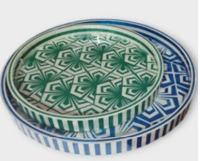 tray of natural wood covered with mother-of pearl in blue, green or black with white.