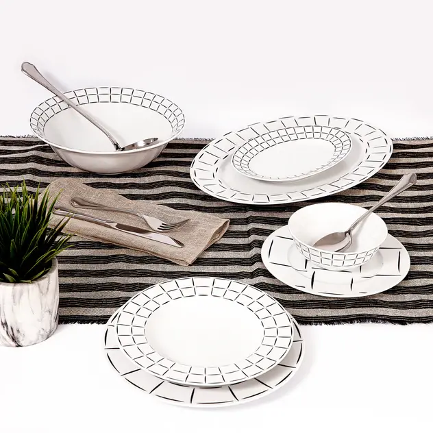 Set of 28 Pieces: 6 Dinner Plates (26cm), 6 Dessert Plates (21cm), 6 Deep Plates (22cm), 6 Bowls (14cm), 1 Salad Bowl (25cm), 2 Pickle Dishes (23cm), 1 Oval Serving Dish (37cm). TU-Carpet-SET.