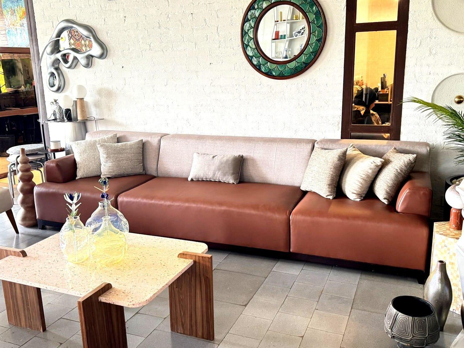 Upholstered 4 seater with wooden base Artificial leather / Fabric