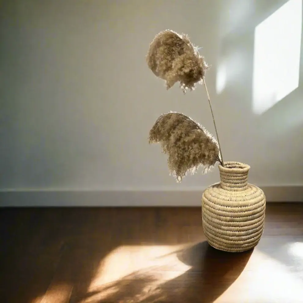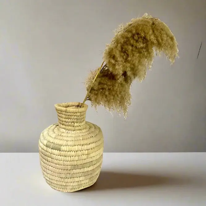 This beautifully crafted vase is made from natural palm leaves, showcasing the intricate artistry of traditional hand weaving techniques. Its natural fibers provide a warm and earthy texture that adds a touch of organic elegance to any space.
