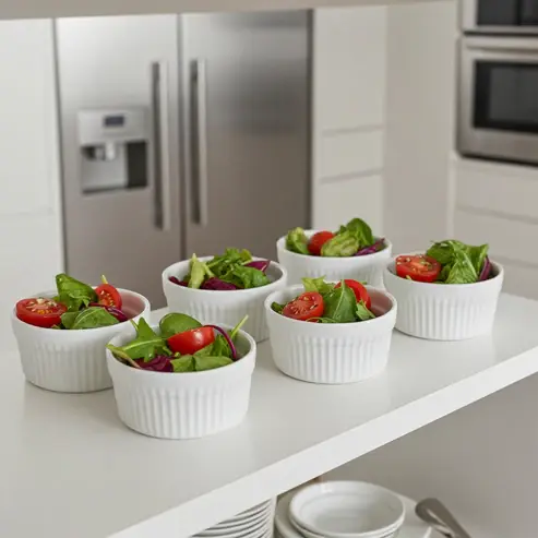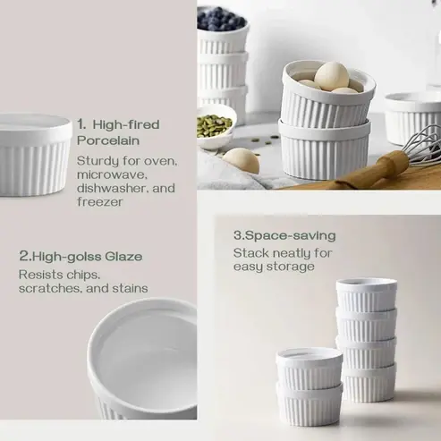 High-fired Porcelain safe for oven, microwave, dishwasher, and freezer. Great for souffle, custards, Creme Brulee, cupcakes and a serving dish, etc.
