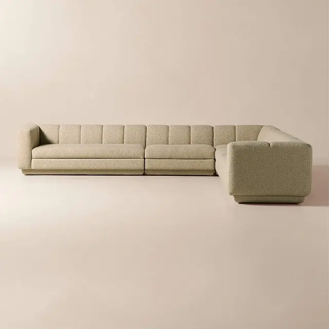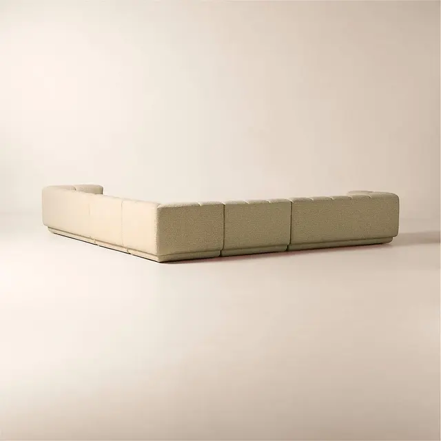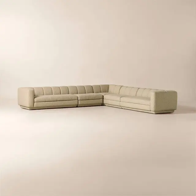 Taking stylistic nods from 1970s Italian design and the designers' own laid-back Southern California aesthetic, five-piece sectional sofa by Lawson-Fenning has generous proportions for gathering and relaxing. A deep seat is complemented by a relaxed back with wide-set channel tufting that highlights the rich texture of the easy-care textured woven performance upholstery. Each piece is assembled by hand to ensure a level of quality befitting the design.