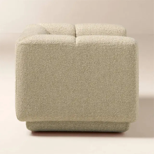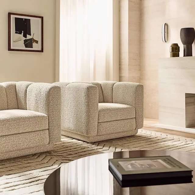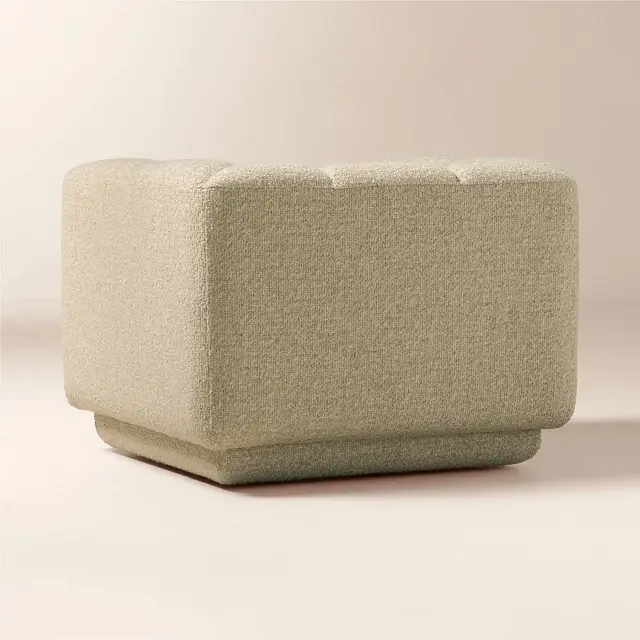 Taking stylistic nods from 1970s Italian design and the designers' own laid-back Southern California aesthetic, the square swivel chair by Lawson-Fenning has generous proportions for gathering and relaxing. A deep seat is complemented by a relaxed back with wide-set channel tufting that highlights the rich texture of the easy-care textured woven performance upholstery. Each piece is assembled by hand to ensure a level of quality befitting the design.