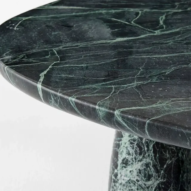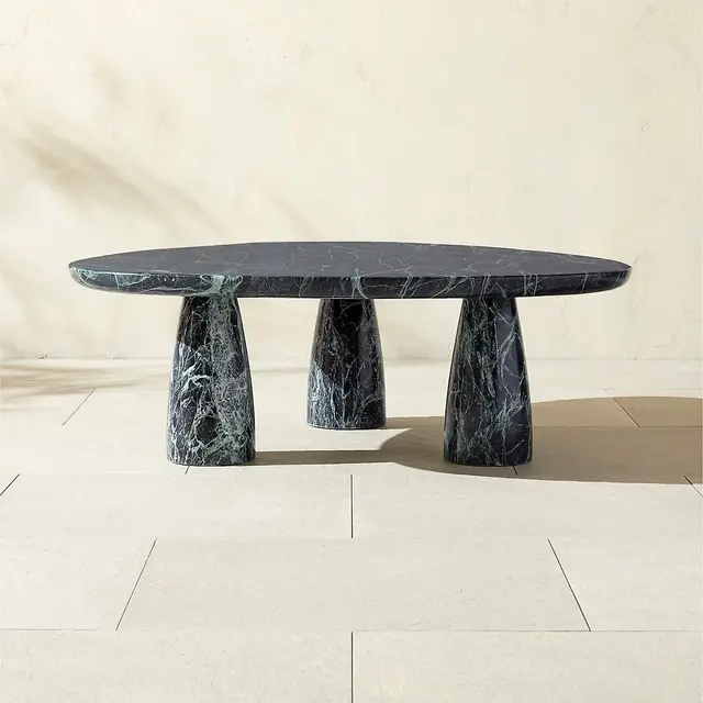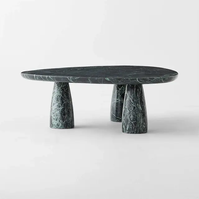 Outdoor coffee table by Portuguese designer Gonçalo Campos draws inspiration from Brazilian modernism. A delicately arching steel frame supports a top of pure honed Spider green marble. Each slab is sourced from a quarry in India and selected for the soft, organic shapes within; due to the characteristics of natural stone, no two pieces will be identical.
