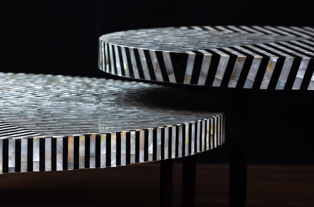 Mother of Pearl Inlay Table Top100D*35HBlack Acrylic & Mother of Pearl Inlayed Top70D*45HBlack Glass Top with Pearl Inlayed Rim withMetal Base.