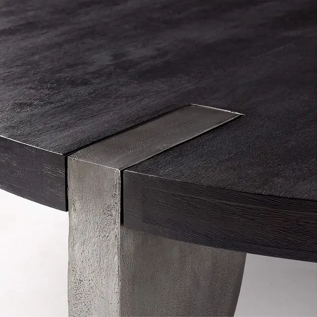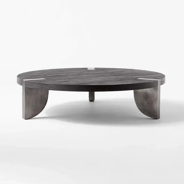 Zola coffee table by Ceci Thomspon is a testament to simplicity. Circular top is supported by cast aluminum quarter-circle legs with an antique finish. Legs fit within hand-carved cutouts in the wooden tops. Wirebrushed for texture, acacia wood top is further enhanced by black stain and light lacquer.