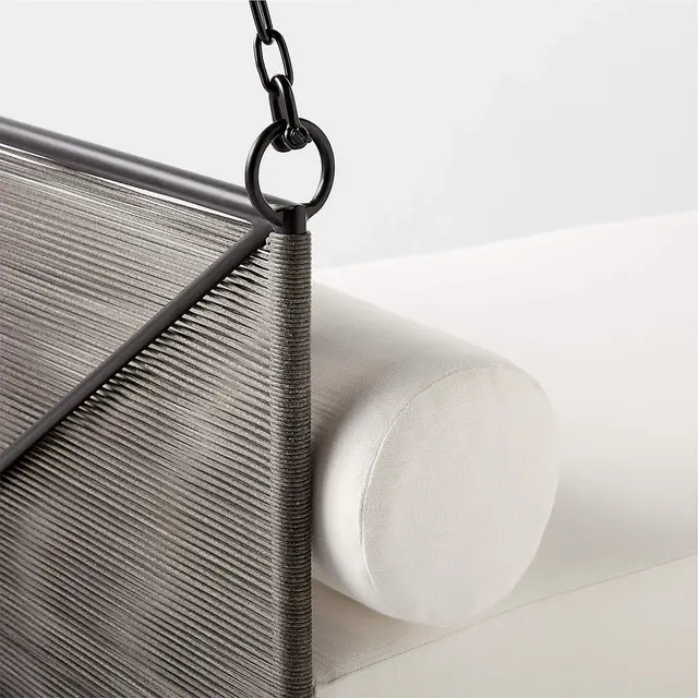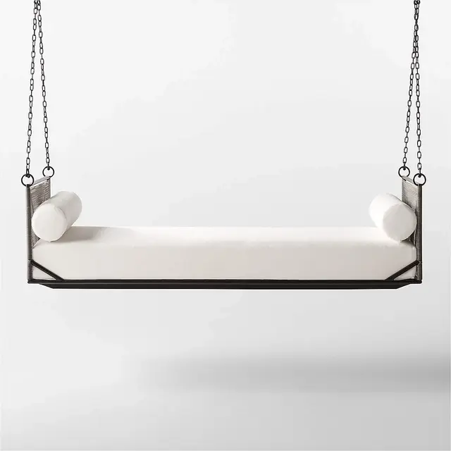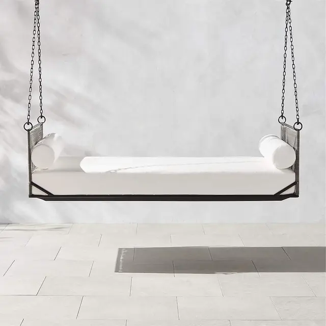 A suspended daybed creates a perch for whiling away the hours. Brett Beldock-designed daybed is inspired by simple industrial architectural shapes and executed in outdoor-friendly materials. Black aluminum frame is wrapped in all-weather rattan, then accented by a performance white cushion and coordinating bolster pillows for a stunning combination.